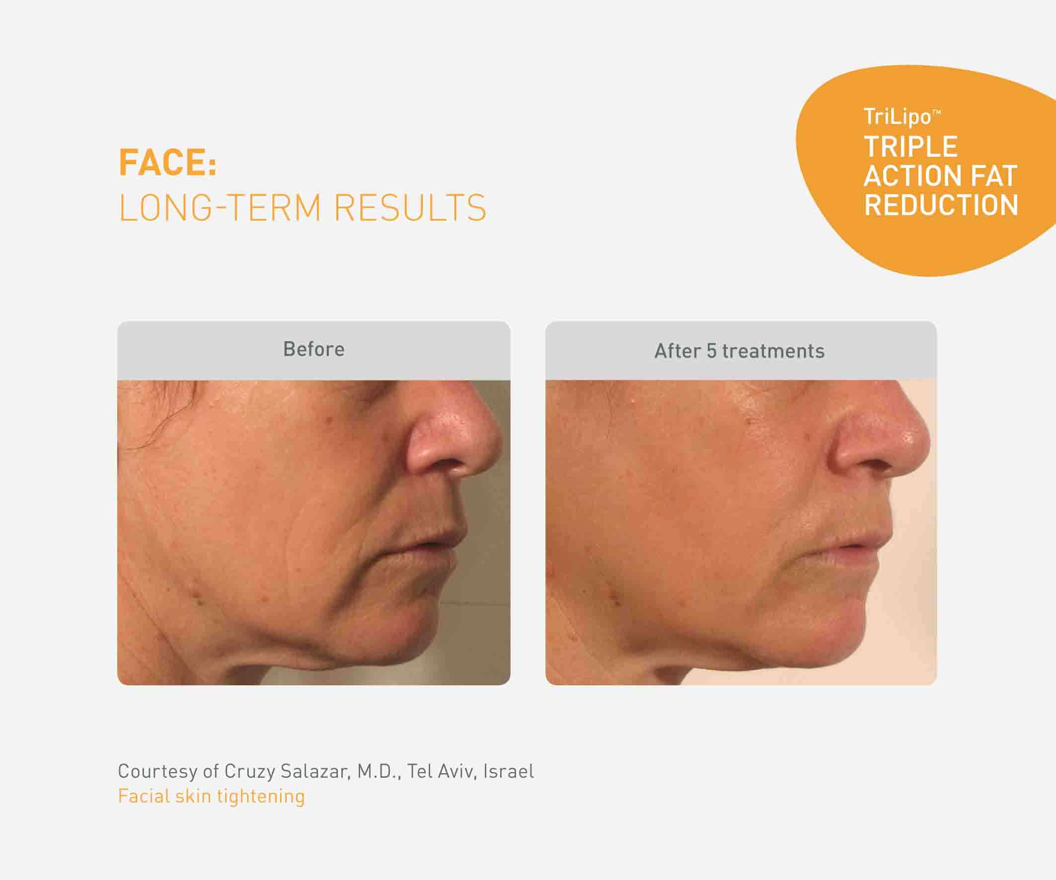With TriLipo MED, healthy, glowing skin is barely a treatment away. TriLipo MED has proven to be a procedure that delivers remarkable rejuvenation, treatment after treatment. Clients report tighter, smoother, more rejuvenated skin, and over the long-term, they witness dramatic wrinkle reduction. Under professional supervision, treatments are safe and non-surgical no preparation is required and there is no recovery period. Patients can return to daily routine immediately. TriLipo MED makes use of THREE individual technologies to treat THREE facial skin layers: the epidermis, the dermis, and the muscle. By comprehensively treating these three skin layers, the TriLipo MED procedure delivers exceptional anti-aging results. Patients marvel at how they feel.